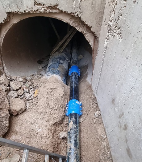 Desde el pozo antiguo parte una tubería de polietileno de unos seis quilómetros y 160 milímetros de diámetro, que había estado fuera de servicio durante varios años. Este conducto es el que se va a utilizar para impulsar el caudal del pozo que se ha equipado hasta el canal, punto donde a través de un bombeo se impulsará hasta la planta de tratamiento del municipio. Para comprobar el estado de la tubería, se ha realizado una prueba de presión, detectando una rotura en la galería que cruza la CV-35 que ha sido reparada.