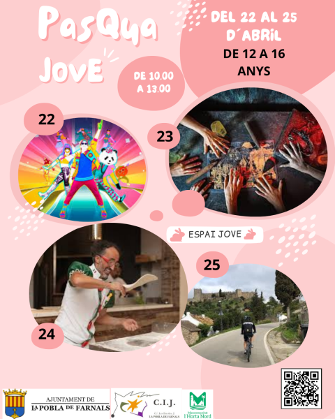 La Pobla de Farnals, 1 de abril de 2025. La concejalía de Juventud del Ayuntamiento de La Pobla de Farnals ha organizado una nueva edición de Pasqua Jove, una propuesta dirigida a jóvenes de entre 12 y 16 años que tendrá lugar del 22 al 25 de abril en el Espai Jove, en horario de 10:00 a 13:00 horas.