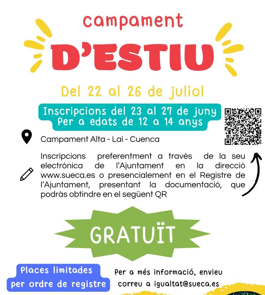 El campamento ofrece 40 plazas. Para poder inscribirse, es necesario presentar una instancia a través de la sede electrónica del Ayuntamiento de Sueca, adjuntando los documentos que se incluyen en el QR del cartel anunciador o que encontrarán en el tablón de anuncios de la web municipal www.sueca.es. El número de plazas disponibles es limitado y se adjudicarán por riguroso orden de entrada de las solicitudes. El plazo para las inscripciones será del 23 al 27 de junio.
