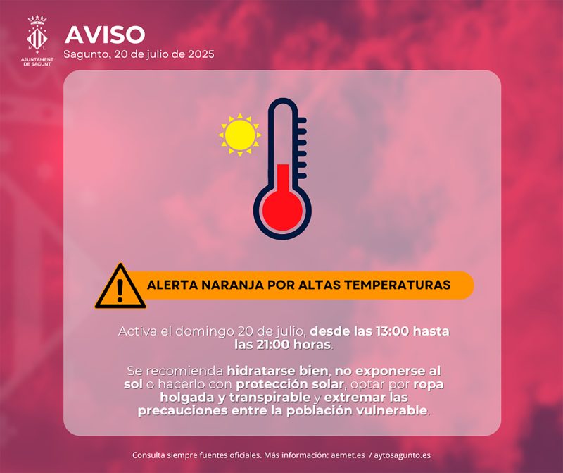 La Agencia Estatal de Meteorología (AEMET) ha elevado la alerta por altas temperaturas a nivel naranja (riesgo importante) para el próximo domingo 20 de julio en todo el litoral norte de Valencia, zona geográfica en la que se encuentra Sagunto. La alerta estará activa desde las 12 a las 21 horas con una temperatura máxima prevista de 39 grados, aunque la AEMET estima que valores más altos se den en el interior.