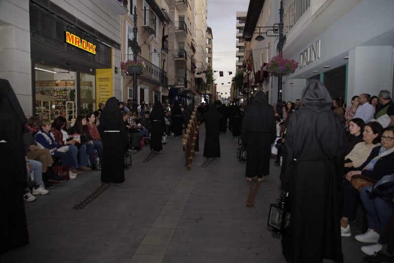El silencio y el sonido de las cadenas forman parte del ambiente de recogimiento de la procesión. Además, la cofradía reserva veinte plazas para penitentes anónimos que participan por promesas personales.
