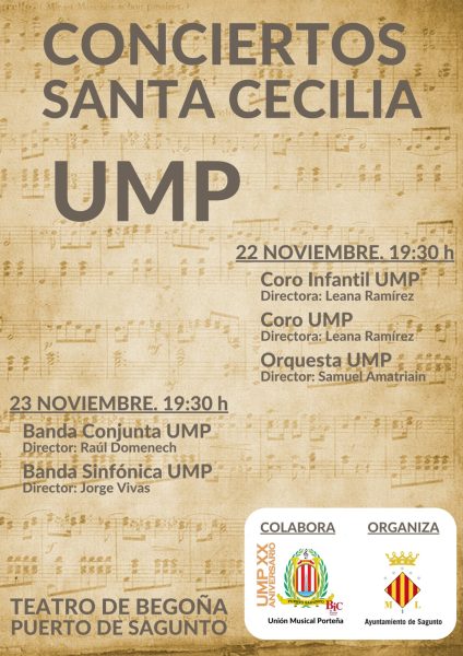 Como parte de la programación otoñal del departamento de Cultura, la Unión Musical Porteña (UMP) y la Orquesta Sinfónica de la Sociedad Musical Lira Saguntina ofrecerán conciertos por Santa Cecilia. Los tres conciertos que ofrecerán ambas entidades tendrán un carácter solidario para ayudar a las sociedades musicales damnificadas por la DANA.