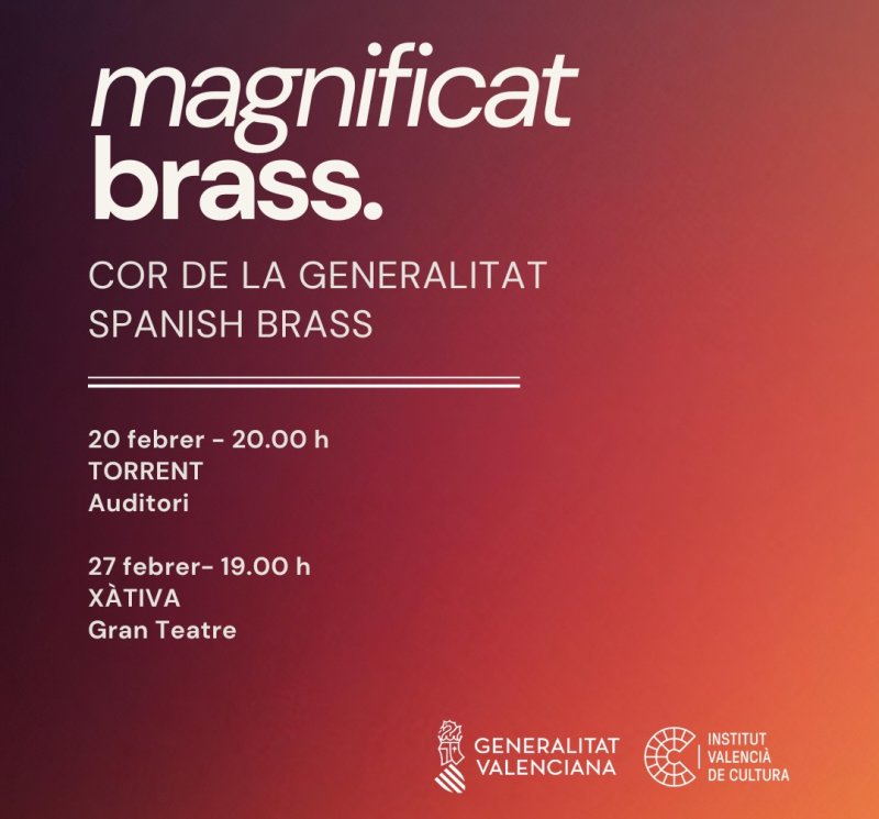 El Cor de la Generalitat y el quinteto de metales Spanish Brass presentan el concierto ‘Magnificat Brass’ en Torrent y Xàtiva, con la dirección de Jordi Blanch Tordera. El viernes 20 de febrero, a las 20.00 horas, el Auditori de Torrent acogerá esta propuesta y el 27 de febrero, a las 20.00 horas, se volverá a interpretar en el Gran Teatre de Xàtiva.