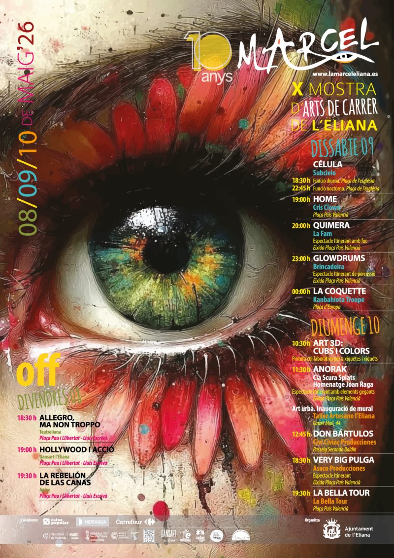 La MARCEL de l’Eliana 2026 regresa del 8 al 10 de mayo con una edición muy especial en la que celebra su décimo aniversario. La Mostra d’Arts de Carrer se consolida como uno de los eventos culturales más destacados del municipio y reunirá más de 14 actividades en distintos espacios públicos.