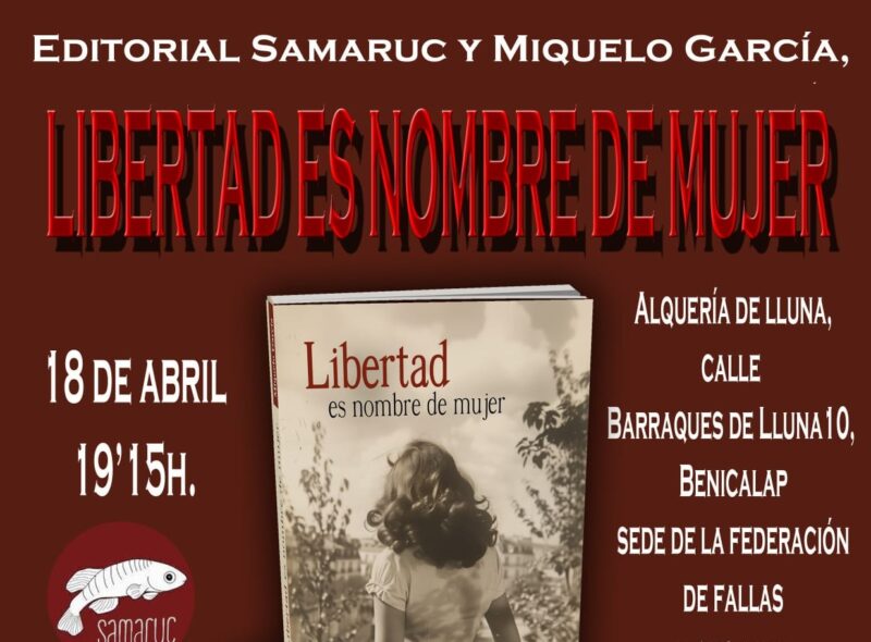 El próximo día 18 de abril, en la sede de la Federación de Fallas de Benicalap –  Campanar, en la calle Barraques de Lluna 10, y a las 19,15h. Miquelo García y Samaruc editorial, presentan su nueva novela, Libertad es nombre de mujer.