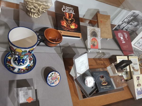 La otra vitrina presenta innumerables elementos relacionados con la historia del Santo Grial. Desde una reproducción del capitel de San Sixto II y San Lorenzo de la Catedral de Jaca, pasando por una reproducción en cerámica de Armenia de Jerusalén de la “Copa de Elías” hebrea, una reproducción de un siclo hebreo en donde ya figura una copa en su reverso, pequeñas colecciones numismáticas donde se refleja la figura del Santo Cáliz, una credencial de peregrino del I Año Jubilar sellada desde San Juan de la Peña, publicaciones de hace más de cien años y las más recientes, la cruz y algunas de las publicaciones que realiza la Cofradía del Santo Cáliz de la Catedral de Valencia.