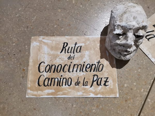 Además, acompaña su magnífico lienzo con una alusión directa a lo que significa el Camino del Santo Grial, Ruta del Conocimiento, camino de la Paz en clave interior. Ha creado una performance a través de la escultura y la palabra que retrotrae al espectador a un mundo íntimo.