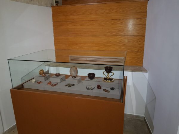 En las diferentes vitrinas se pueden observar dos temáticas bien distintas. Una relacionada directamente con la pieza del Santo Grial. La reproducción del Santo Cáliz elaborada por Orfebres Piró de Valencia capta la atención de inmediato. A su alrededor se encuentra una verdadera colección de pequeñas copas talladas en ágata, cornalina sardónice, jaspe rojo e incluso ónice que, bien merece la pena ver.