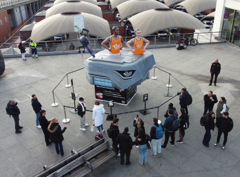 El Roig Arena, el futuro recinto multiusos de Valencia impulsado por Juan Roig, ha instalado esta mañana un monumento que reproduce su arquitectura exterior en la entrada de la Estación de Atocha de Madrid.