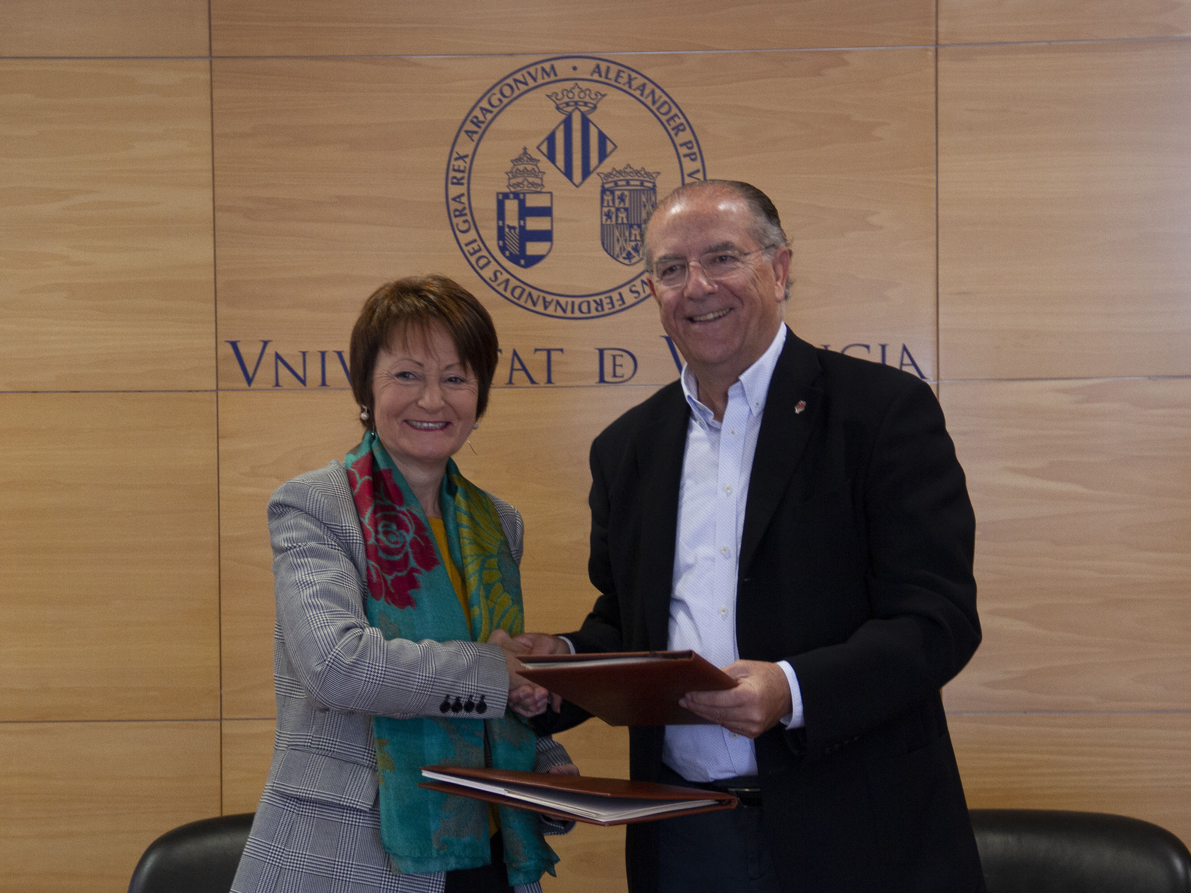 La rectora de la universidad, Maria Vicenta Mestre y el Consejero Delegado de Valencia Basket, Paco Raga, han plasmado su firma sobre el acuerdo que certifica la colaboración entre ambas entidades.