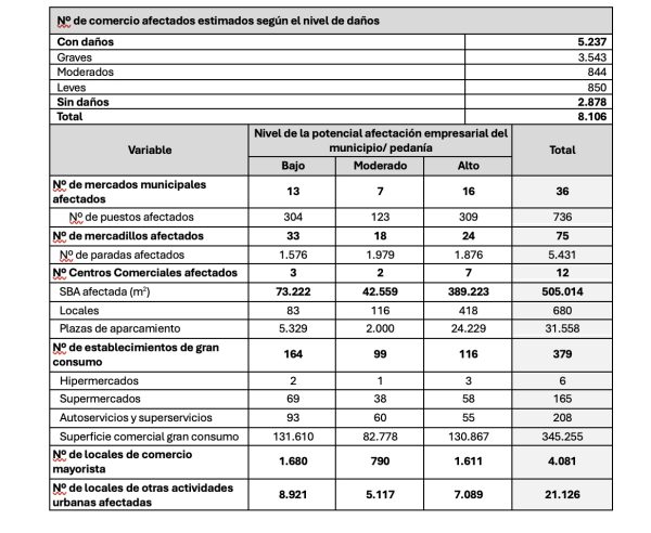 De los 8.106 comercios minoristas con establecimiento físico en los municipios afectados, se estima que el 64,5% (5.228 comercios) podrían haber sufrido daños directos. De estos, el 67,6% presentan daños graves, el 16,1% daños moderados y el 6,3% daños leves.