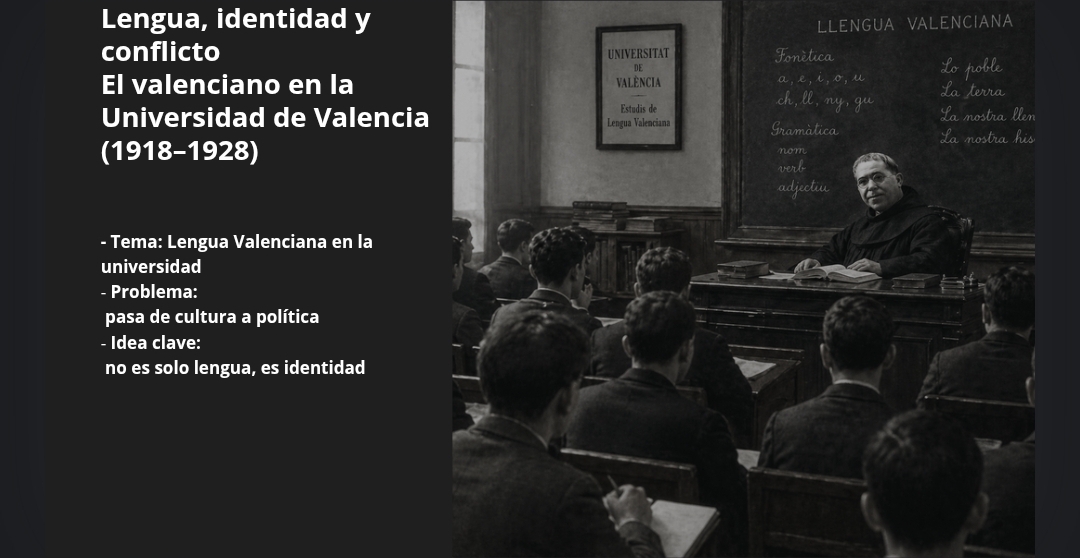 En 1918, por ejemplo, un periódico anuncia que “se inaugurará en un aula de la Universidad cedida por el Rectorado, la primera clase de Lengua Valenciana, impartida por el padre Luís Fullana i Mira (La Correspondencia de España, 1918). Esto es importante porque muestra que no era algo marginal ni extraordinario.