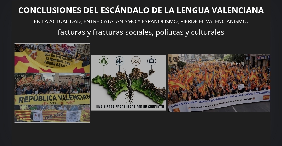 La Lengua Valenciana pasa de ser una cuestión cultural a convertirse en un problema político, que afecta tanto a las instituciones como a la vida cotidiana de las personas. Además, este conflicto no se queda en el pasado. Hoy en día siguen existiendo debates sobre el Idioma Valenciano en ámbitos académicos, políticos y sociales. Lo que demuestra que aquel “escándalo” no fue algo puntual, sino el inicio de una discusión que todavía sigue abierta. Que ha derivado en un conflicto actual no cerrado satisfactoriamente. En el que las partes implicadas, incapaces de ceder en sus pretensiones, no han llegado a un consenso. Pagando con ello las facturas y fracturas sociales, políticas y culturales, que hoy día todavía padece la Región Valenciana.