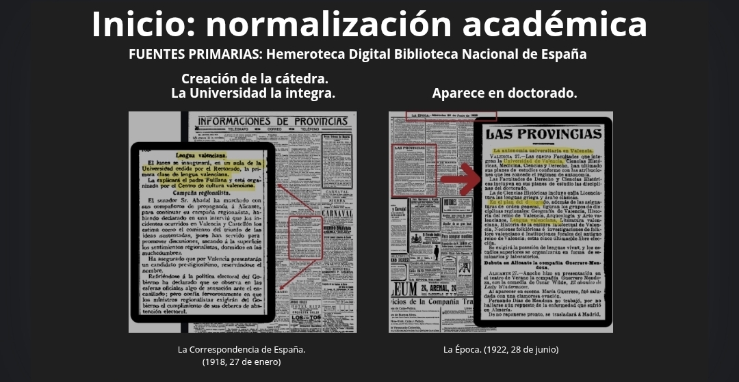 La universidad cedía un aula, es decir, lo integraba dentro de su funcionamiento habitual. Y porque además, no se trataba sólo de una clase puntual, ya que años después la prensa también recoge que la “Lengua Valenciana formaba parte de los estudios de doctorado” (La Época, 1922). Lo que indica que estaba dentro de los planes de estudio y tenía reconocimiento académico.