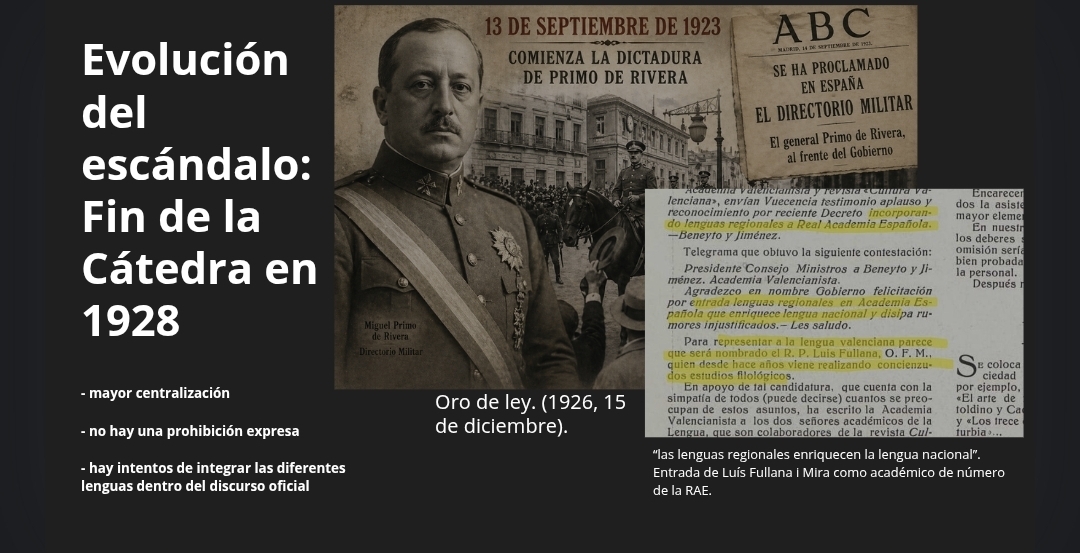 Esto forma parte de las consecuencias de los vaivenes de la propia dictadura. Ya que al mismo tiempo, también hay intentos de integrar las diferentes lenguas dentro del discurso oficial. En 1926, se dice, en el contexto del ingreso del padre Luís Fullana i Mira como académico de número de la RAE en representación de la Lengua Valenciana, que “las lenguas regionales enriquecen la lengua nacional” (Oro de ley, 1926). Esta idea parece positiva, pero en realidad también implica que esas lenguas quedan subordinadas a una idea de nación más amplia. Y por todo ello tenemos un claro caso de escándalo ampliamente desarrollado en el tiempo.