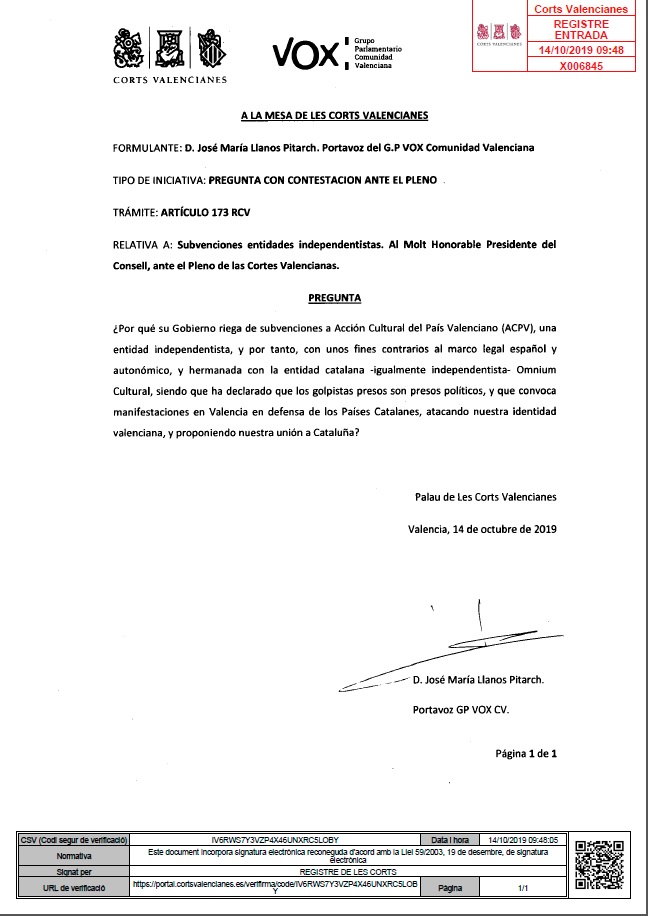Así mismo José María Llanos ha dirigido una pregunta del Grupo Parlamentario VOX en las Cortes Valencianas al presidente de la Generalitat, Ximo Puig, para el próximo pleno del día 17 solicitando explicaciones sobre las subvenciones a entidades Catalanistas.