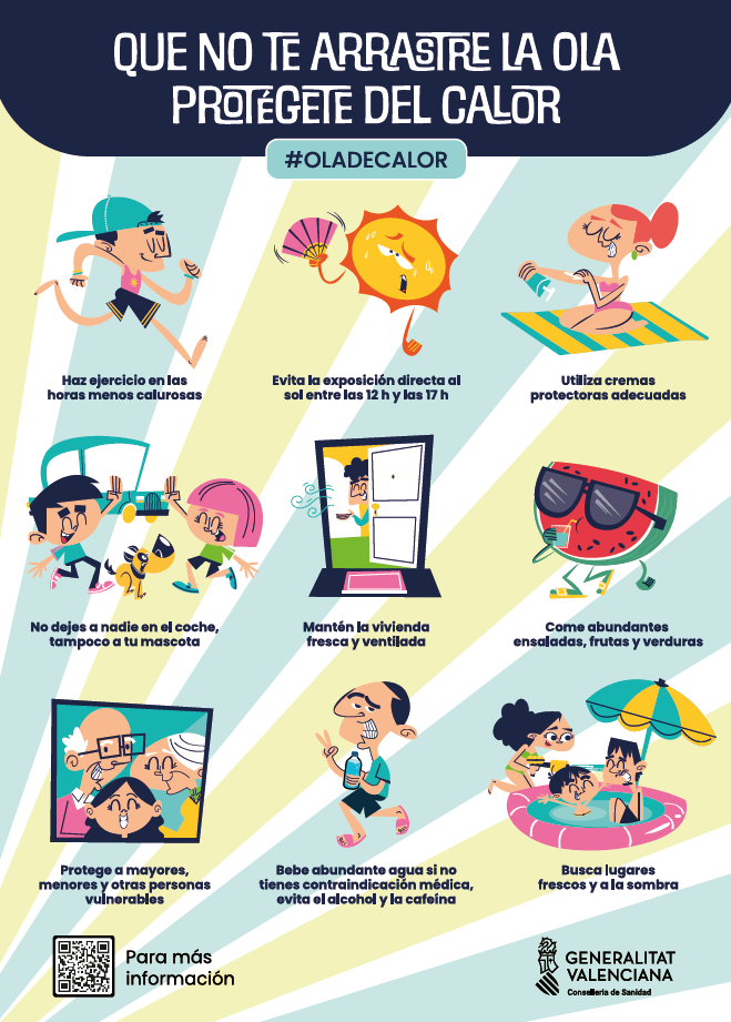 La Conselleria de Sanidad ha puesto en marcha una campaña de sensibilización dirigida a la ciudadanía para prevenir los problemas de salud ocasionados por las altas temperaturas, y concienciar sobre la importancia de tomar medidas preventivas para evitar los efectos adversos del calor extremo.