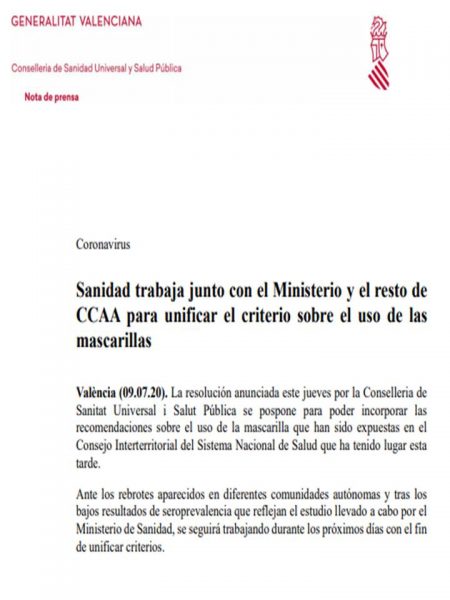 En la rueda de prensa la Consellera Ana Barceló ha reconocido que no entra en los planes de la Generalitat Valenciana el uso obligatorio de las mascarillas en los espacios abiertos. Aunque en el Consejo Interterritorial de la tarde se puso de manifeisto la diferencia entre las Comunidades Autónomas y el estao ha decidido trabajar para una regulación conjunta.