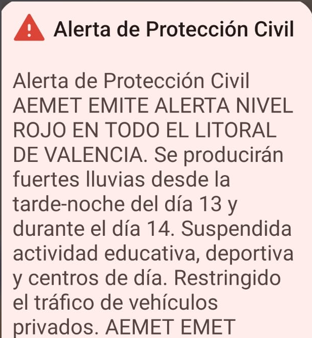 Según la previsión de AEMET, las lluvias pueden ir acompañadas de tormentas y la precipitación máxima acumulada puede llegar en una hora a 40 litros por metro cuadrado y en 12 horas a 180 litros por metro cuadrado para las zonas con nivel rojo. Tras este boletín de AEMET, el Centro de Coordinación de Emergencias de la Generalitat ha establecido el aviso rojo por lluvias en todo el litoral de Valencia.