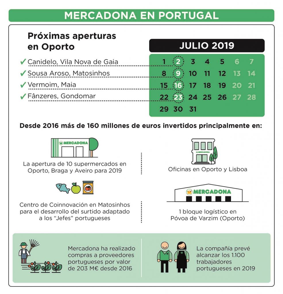 Con esta apertura se inicia el proyecto de internacionalización de la compañía, en el que ha invertido más de 160 millones de euros hasta la fecha, destinados principalmente a la construcción de los supermercados; de un bloque logístico ubicado en Póvoa de Varzim (Oporto); de sus oficinas ubicadas en Oporto y Lisboa; y de un Centro de Coinnovación en Matosinhos (Oporto), donde realizar sesiones de coinnovación con los clientes portugueses para el desarrollo de un surtido adaptado a sus gustos. Con el objetivo de continuar creando riqueza y progreso en Portugal, Mercadona tiene previsto invertir en 2019 más de 100 millones de euros en dicho país, con lo que la inversión global del proyecto Mercadona Portugal sobrepasaría los 260 millones de euros desde que anunció su entrada en el país vecino en 2016.