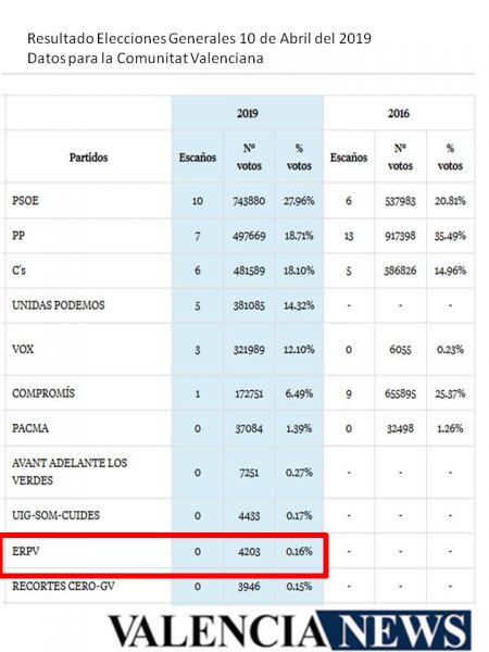 Afirma que tiene derecho a habalr de ello, porque su marca en la Comunitat Valenciana es ERPV y se presenta a las elecciones en las tres circunscripciones valencianas estas próximas lecciones del 10N. Se presentan en Alicante, Castellón y Valencia. Reclaman por ello, a pesar de sus más que discretos resultados sud erecho a hablar del esa independencia también para el territorio valenciano.