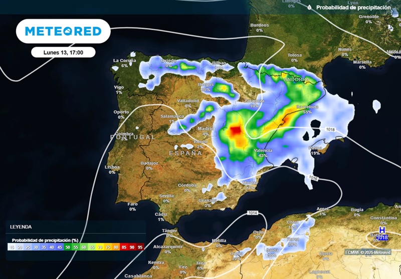 Por lo tanto, la distribución de las lluvias este lunes será más dispersa, pero se seguirán produciendo tormentas localmente fuertes, especialmente en entornos de montaña y áreas del este y centro peninsular.