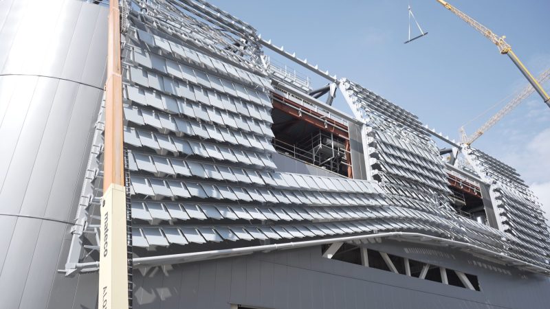 En estos momentos se ha iniciado la instalación de la estructura de lamas en la zona oeste, una de las más complejas debido a su mayor voladizo y por ser la futura ubicación del icónico «ojo», una gran pantalla que dará al exterior en la principal zona de acceso del recinto, justo frente al gran parque público que lo conectará con el parking. Cuando finalice la instalación, 8.600 lamas rodearán el Roig Arena conformando su segunda piel.