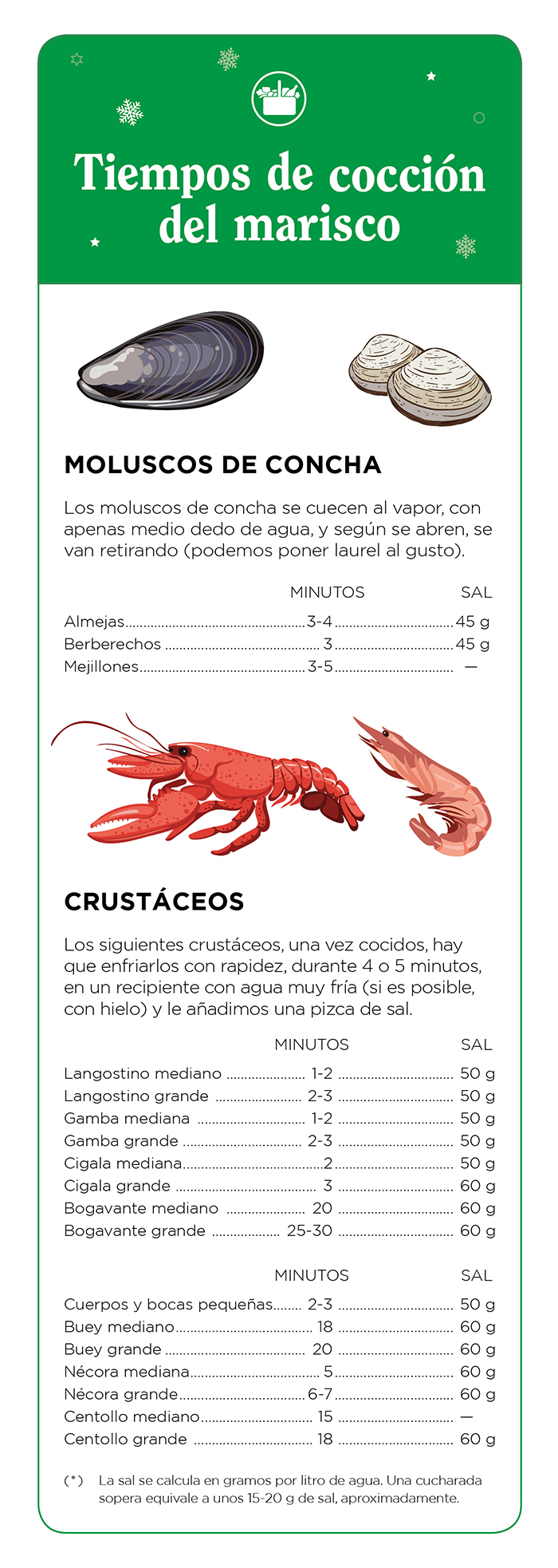 - Es recomendable cocer los mariscos en agua con abundante sal, en la proporción que se indica en la tabla de tiempos de cocción (una cucharada sopera de sal = 15-20 gramos).