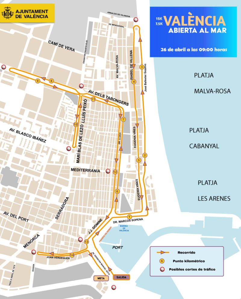 Por otra parte, el domingo 26 de abril está programada la 14ª edición de la 15K València Abierta al Mar, así como la 6ª edición de esta misma carrera en formato 7,5K, organizadas ambas por el diario Las Provincias en los distritos de Poblats Marítims y Algirós. Estas pruebas, en las que están inscritas unas 12.000 personas, se desarrollarán de 9.00 a 11.00 horas.