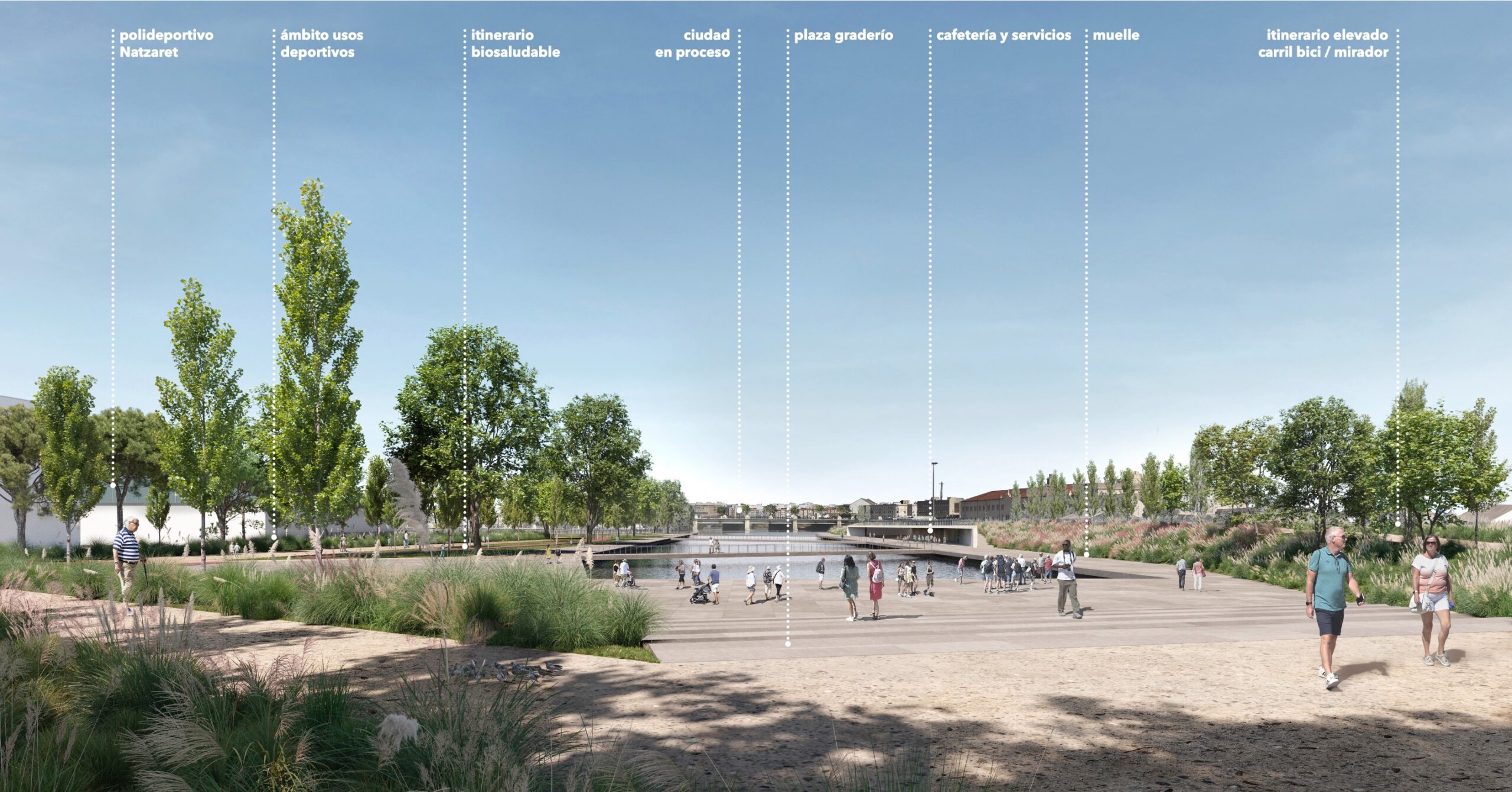 Este proyecto da total protagonismo al río y al agua. Ocupando gran parte el río con sendas sobre el mismo al estilo laguna en la parte inicial cercana a Nazaret. También uno de sus iconos es el de un mirador icónico sobreelevado al estilo del parque de cabecera pero de diseño mucho más moderno para contemplar el río.