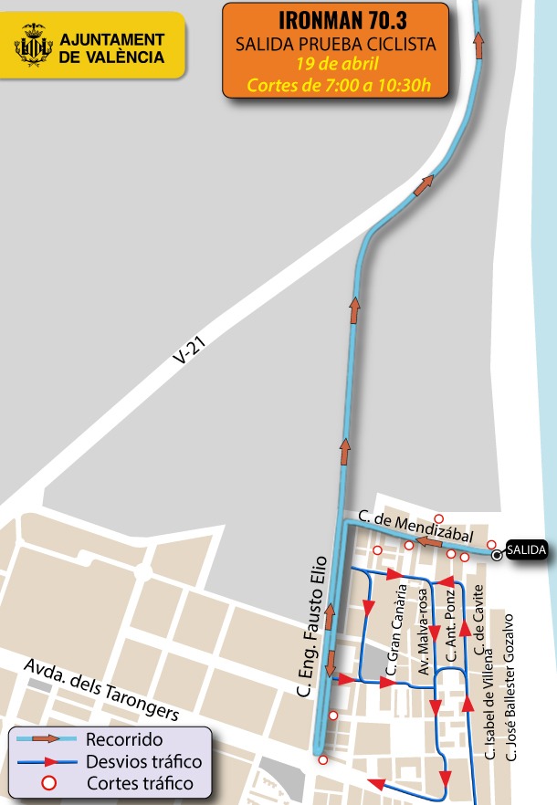 La tercera edición del triatlón de media distancia Ironman 70.3, organizado por Ironman Spain SL con el apoyo del Ayuntamiento de València y la Fundación Deportiva Municipal, consta de tres pruebas, pero será la de ciclismo la que provocará más afecciones a la circulación durante la mañana del domingo, especialmente en la zona sur de la ciudad.