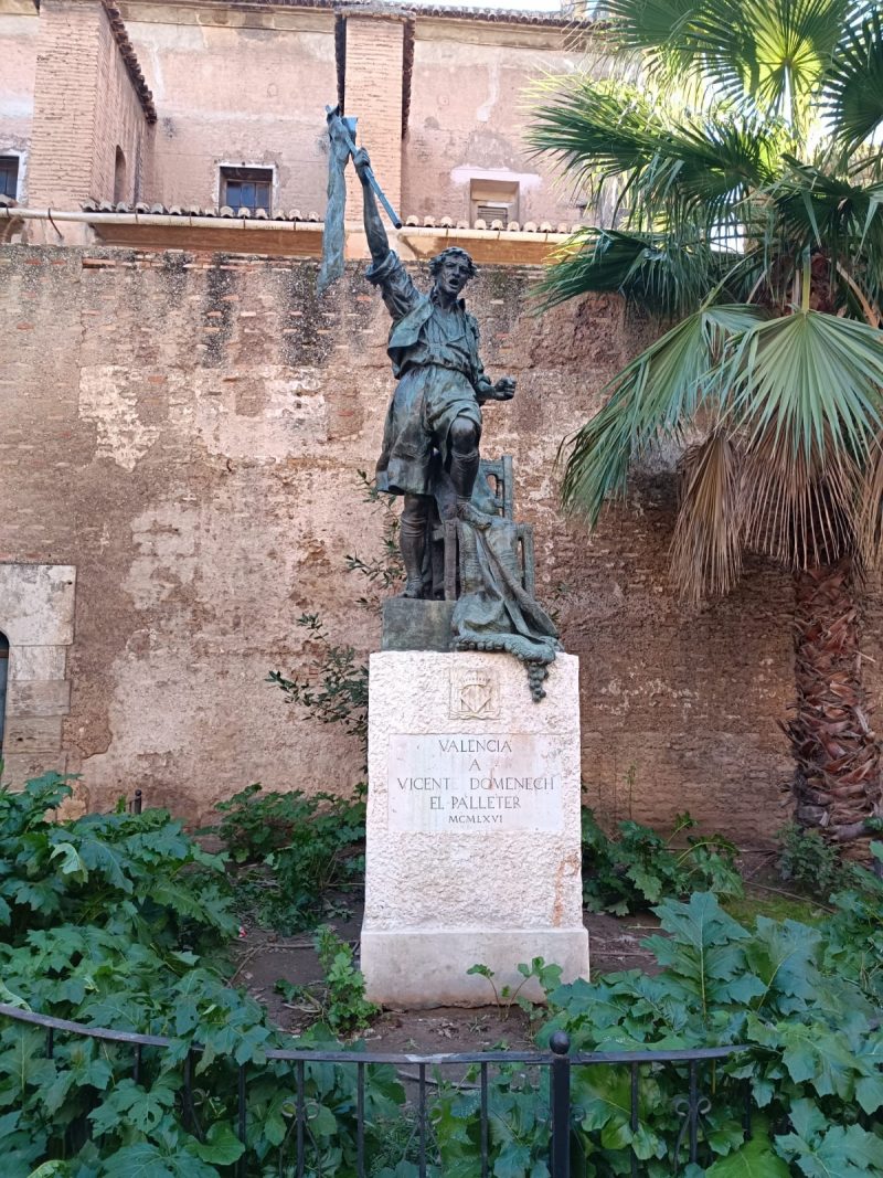 Este fue el lugar elegido para colocarla ese mismo año, delante de un pequeño trozo de la antigua muralla que todavía perdura. En el pedestal sobre el que está izada la figura, se esculpió el escudo de la ciudad y la siguiente dedicatoria: “Valencia a Vicente Domenech el Palleter”. La figura ahora restaurada es una copia de la que el propio escultor Emilio Calandín presentó en la Exposición Nacional de Bellas Artes de 1901, donde fue premiado junto a Mariano Benlliure y Joaquín Sorolla.