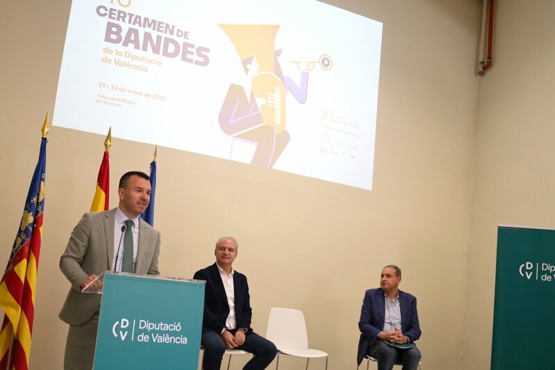 La Diputació de València ha presentado este martes la 48ª edición de su Certamen de Bandas, un evento que este año pretende ser “un homenaje a todas las sociedades musicales, músicas y músicos afectados por la DANA y, por supuesto, a las víctimas del trágico episodio registrado en la provincia”. En este mensaje han coincidido el presidente, Vicent Mompó, y el diputado responsable de Bandas, Ricardo Gabaldón, que han comparecido ante los medios en vísperas del concurso que se celebrará el próximo fin de semana en el Palau de la Música de Valencia.