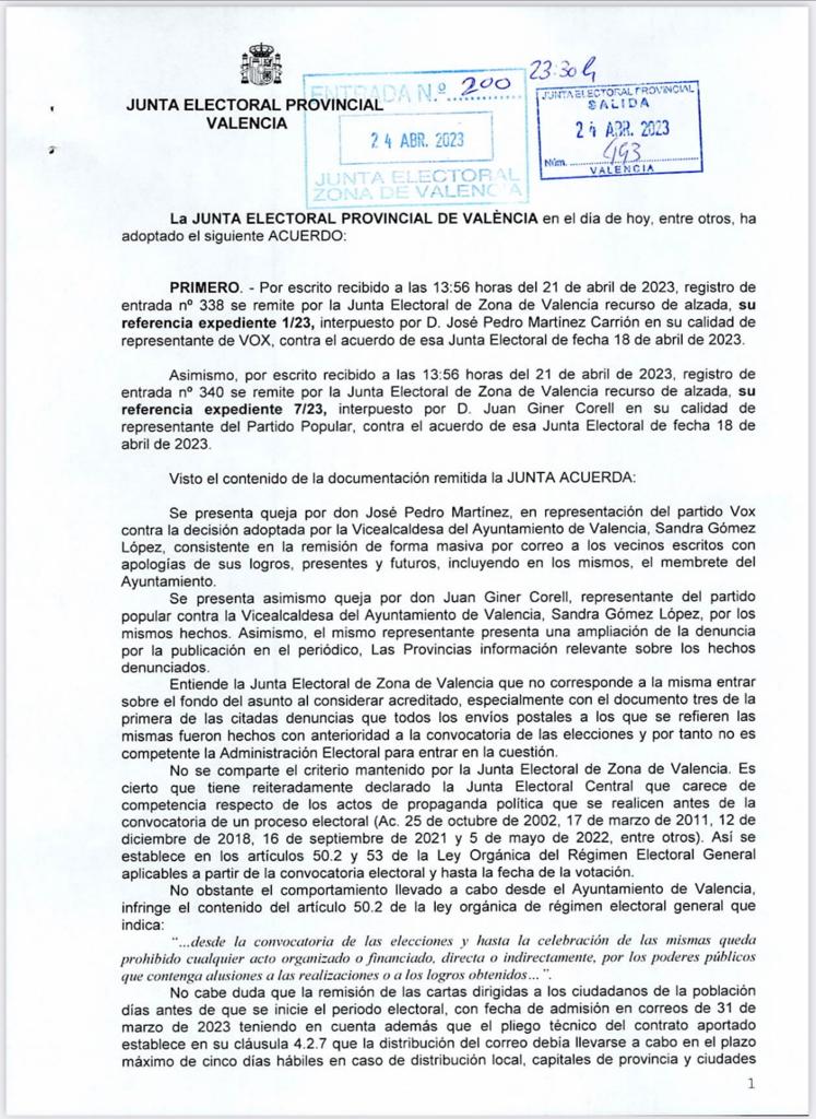 La Junta Electoral transmite a la Junta Electoral de Zona de Valencia que proceda a elevar la multa ante la posibilidad de la comisión de una infracción electoral por el envío de las cartas y su llegada a los hogares del Cap i Casal dentro de la campa electoral ya convocada.
