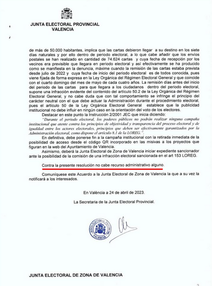 La Junta Electoral provincial de Valencia en un escrito fechado ayer mismo exige al Ayuntamiento de Valencia la retirada de la campaña «institucional» de logros conseguidos por la vicealcaldesa y que deje de funcionar el enlace al código QR que existen en las más de 70.000 cartas enviadas.