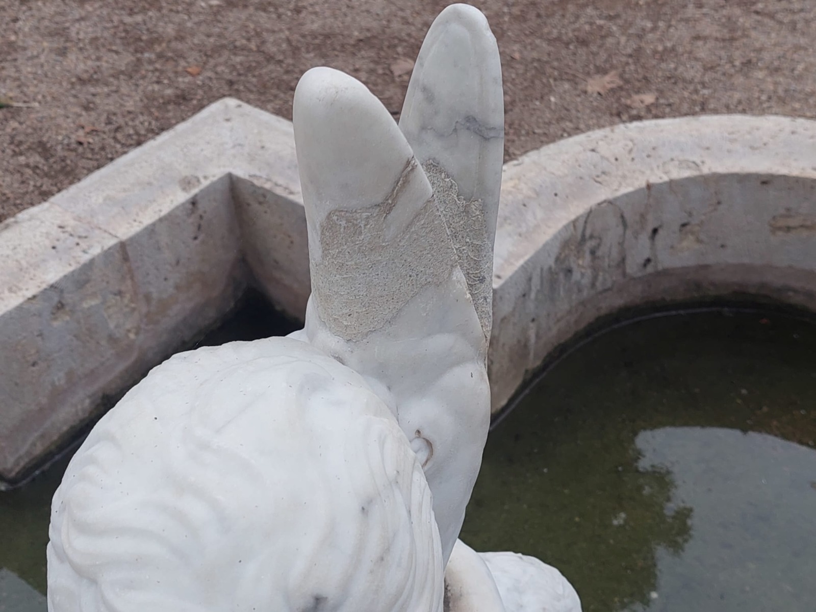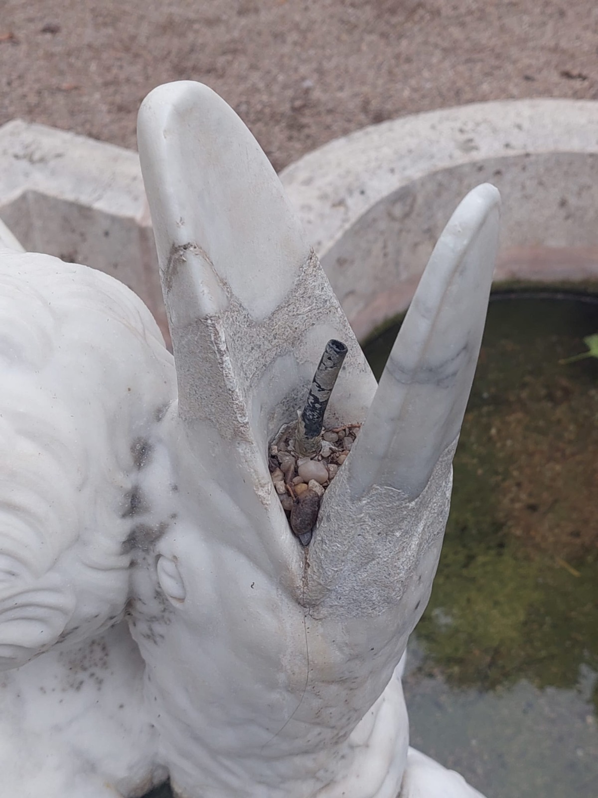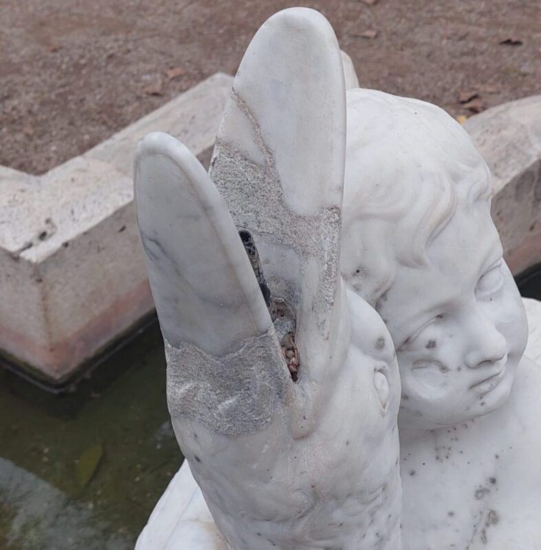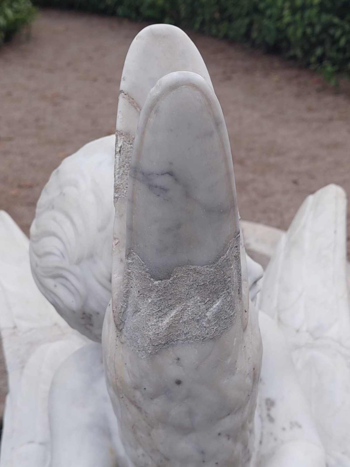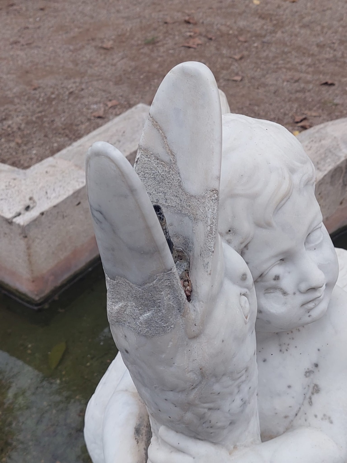 Ayer mismo el Círculo del Patrimonio se trasladó nuevamente al Jardín de Monforte y pudo fotografiar la «intervención» llevada a cabo por patrimonio histórico de pegado del ala y culo pel cisne, pegadas con un material que evidencia la falta de profesionalidad (como aseguran los expertos) y que muestra un pegote a modo de pegado.