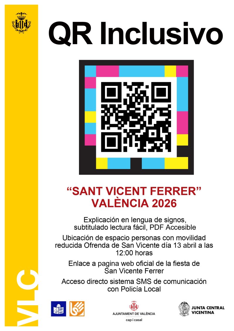 El QR inclusivo contiene además un enlace directo al programa oficial de la fiesta de Sant Vicent Ferrer 2026 en la página web de la Junta Central Vicentina y también una explicación de la festividad, adaptada a diferentes lenguajes, en castellano y en valenciano.