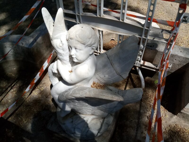 En el jardín de Monforte (BIC) podemos encontrar una pequeña alberca con una fuente compuesta por la figura de un Niño Cabalgando sobre un Cisne. Las imágenes son de abril de 2022, antes de su «restauración»