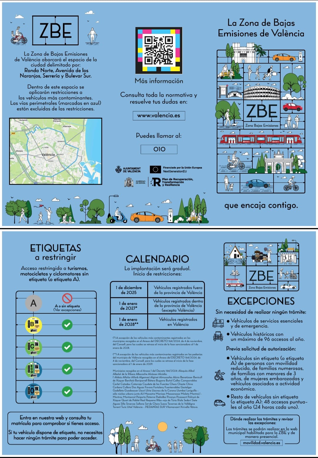 “Se contempla una implantación progresiva de la Zona de Bajas Emisiones porque el 1 de enero de 2027 la prohibición de acceso y circulación afectará a los vehículos con etiqueta A de fuera de la ciudad de Valencia y el 1 de enero de 2028 la prohibición alcanzará a todos los vehículos con etiqueta A, incluidos los de la propia ciudad de València”, ha resaltado, tras puntualizar, que, “en todo caso, existirán excepciones en atención a circunstancias personales vinculadas a la discapacidad, familias numerosas, familias con menores de tres años, mujeres embarazadas, entre otros supuestos, y también se permitirá 48 accesos puntuales con carácter anual a cualesquiera vehículos”.